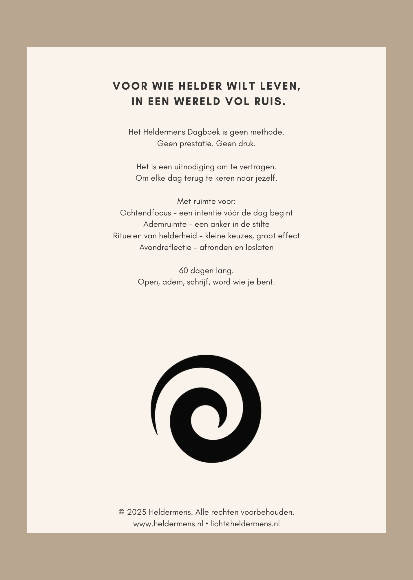 Het Heldermens Dagboek is een stijlvol en minimalistisch dagboek dat je dagelijks terugbrengt naar wat telt: rust, ritme en innerlijke helderheid.